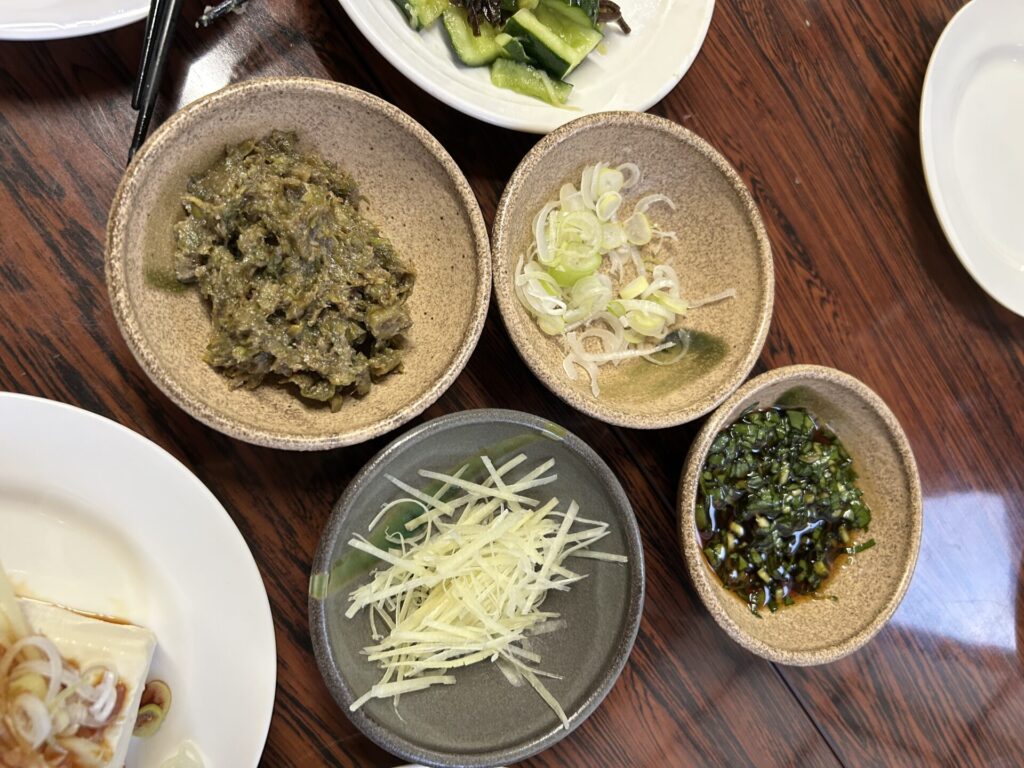 「冷奴」は「生姜」「ネギ」「行者ニンニク」「ふきのとう味噌」の4種類のトッピング