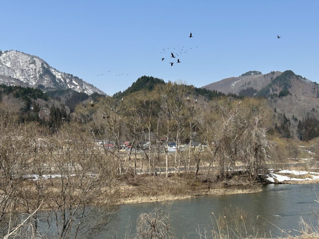 役場裏の中州にはアオサギとカワウがびっちり営巣していました😱